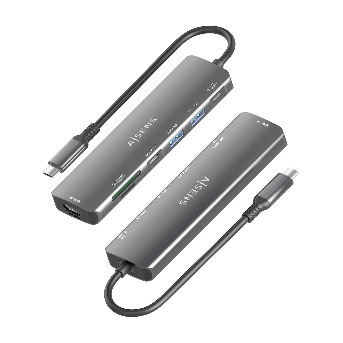 The ASUC-7P026-GR from Aisens is an advanced USB hub designed to maximize connectivity for laptops and USB-C compatible devices, especially suited for users seeking efficiency and versatility in professional or home environments. This model, featuring an elegant grey finish and made of durable plastic, offers a 7-in-1 configuration that includes key connections such as HDMI for high-definition video output suitable for external monitors or projectors, two USB-A 3.2 ports, and two USB-C 3.2 Gen 1 (3.1 Gen 1) ports for fast data transfers and simultaneous peripheral charging. It also features a USB-C port with Power Delivery up to 100 W, providing efficient power to compatible laptops and tablets, streamlining work without the need for extra chargers. Integrated SD and MicroSD card slots make it easy to transfer files directly from cameras and other external storage devices. Its compact design and 15 cm cable allow for easy transport and convenient setup on any desk. This Aisens USB hub is a comprehensive solution for those needing a single device to connect displays, storage drives, and multiple accessories, all while maintaining top speed and compatibility thanks to USB 3.2 and HDMI standards. The ASUC-7P026-GR stands out as a practical and reliable option to effectively expand the connectivity of any modern device.